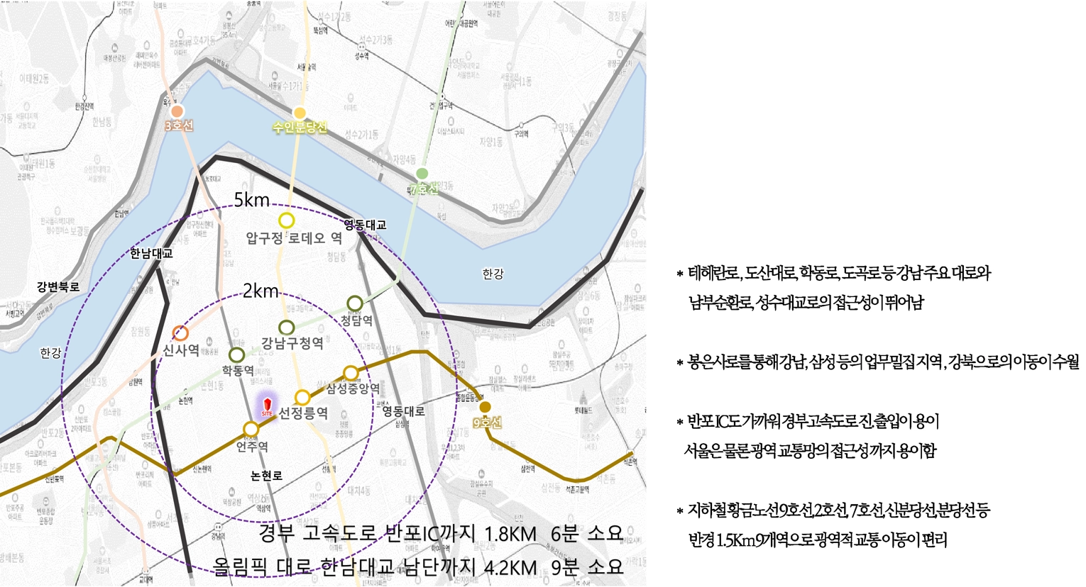강남권 쿼트러플 역세권과 경부고속도로, 올림픽대로의 최고의 교통 프리미엄